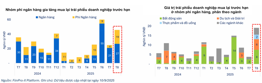 Đáng chú ý, cục diện thị trường tháng 8 ghi nhận sự dịch chuyển trong cán cân mua lại. Nếu trước đây ngân hàng thường chiếm ưu thế trong hoạt động mua lại trái phiếu, thì nay khối phi ngân hàng cho thấy đà vươn lên khi chi tới 19.000 tỷ đồng để mua lại trước hạn, tức gần gấp 5 lần so với tháng trước, tiệm cận so với mức 27.000 tỷ đồng của nhóm ngân hàng.