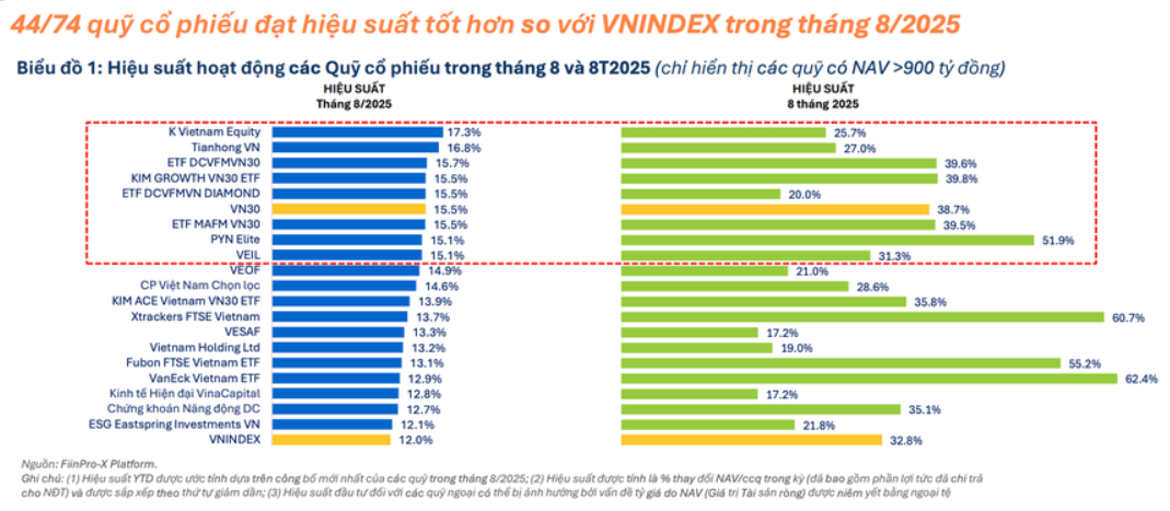 Trái với dòng tiền, báo cáo của FiinGroup chỉ ra, hiệu suất đầu tư trong tháng 8/2025 lại rất khả quan. 44/74 quỹ cổ phiếu đạt hiệu suất vượt VN-Index, mức sinh lời bình quân +12,9%.