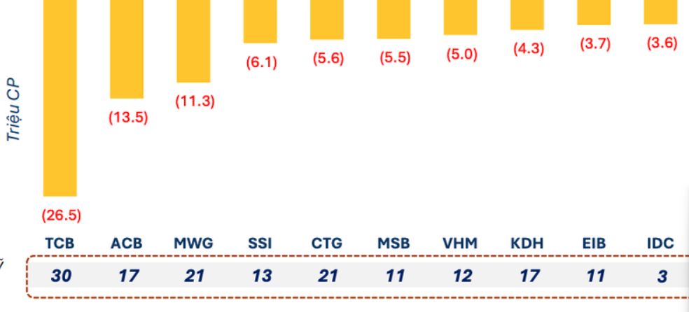 Ngược lại, cổ phiếu ngân hàng vốn hóa lớn (TCB, ACB) và bất động sản (VHM, KDH) tiếp tục bị bán ròng. TCB dẫn đầu về khối lượng bán, với nhiều quỹ ngoại và quỹ mở cùng tham gia. VHM, KDH cùng xuất hiện trong top 10 cổ phiếu bị bán mạnh nhất tháng 8.