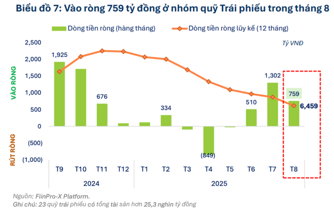 Trong khi quỹ cổ phiếu biến động, quỹ trái phiếu duy trì hút vốn. Tháng 8, nhóm này vào ròng 759 tỷ đồng, đánh dấu tháng thứ ba liên tiếp dương, dù quy mô giảm 41,7% so với tháng trước.