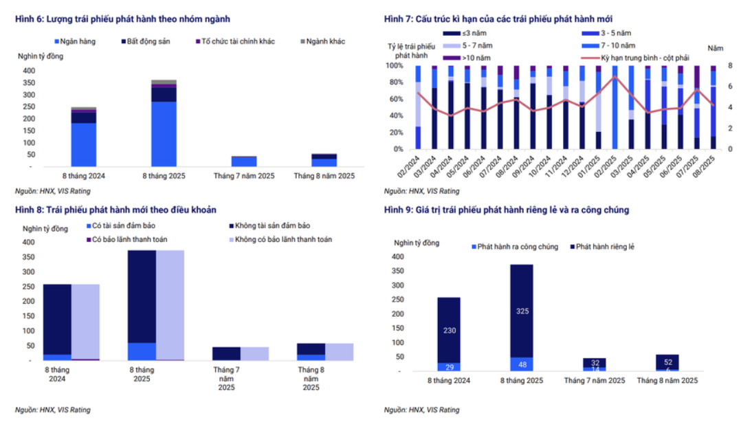 Trong khi đó, báo cáo của Hiệp hội Thị trường Trái phiếu Việt Nam (VBMA), 8 tháng đầu năm 2025 có 23 đợt phát hành ra công chúng với giá trị 47.785 tỷ đồng, chiếm 12,7% tổng giá trị phát hành, còn lại đến từ phát hành riêng lẻ chiếm tỷ trọng áp đảo 87,3%.