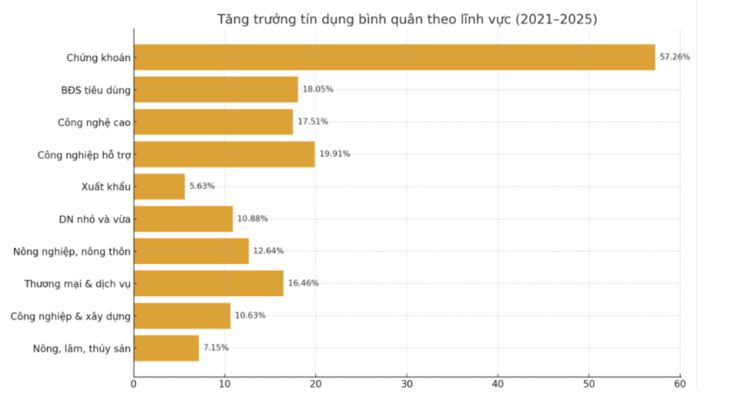 Xét tăng trưởng tín dụng theo ngành kinh tế, bình quân giai đoạn 2021-2025 tín dụng (1) nông, lâm, thủy sản tăng 7,15%/năm; (2) công nghiệp và xây dựng tăng 10,63%/năm; (3) thương mại và dịch vụ tăng 16,46%/năm.